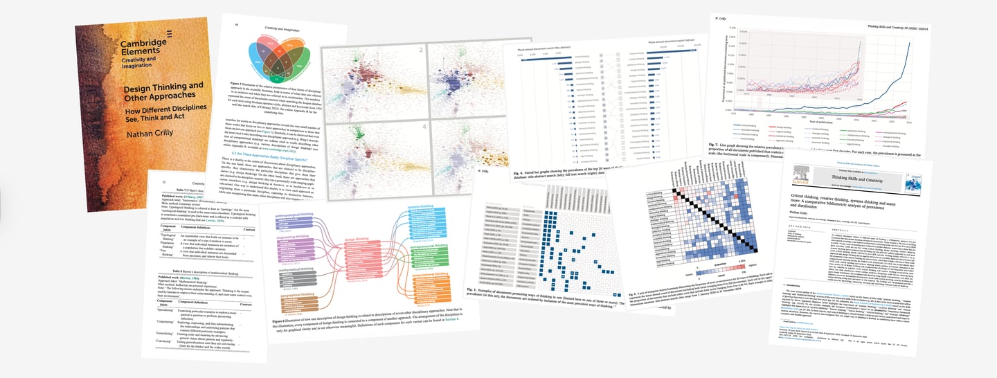 The first of these is a short book exploring the conceptual relationships between different ways of thinking, especially design thinking, systems thinking, entrepreneurial thinking and computational thinking (but also many more). The second is a journal paper analysing the relative prevalence and distribution of twenty ways of thinking in the research literature (selected from an initial sample of 78). These publications describe the underlying data sources along with the associated methods of extraction, processing and representation. The publications also detail the assumptions behind the representations, the limitations associated with these and proposes further work that would address them.